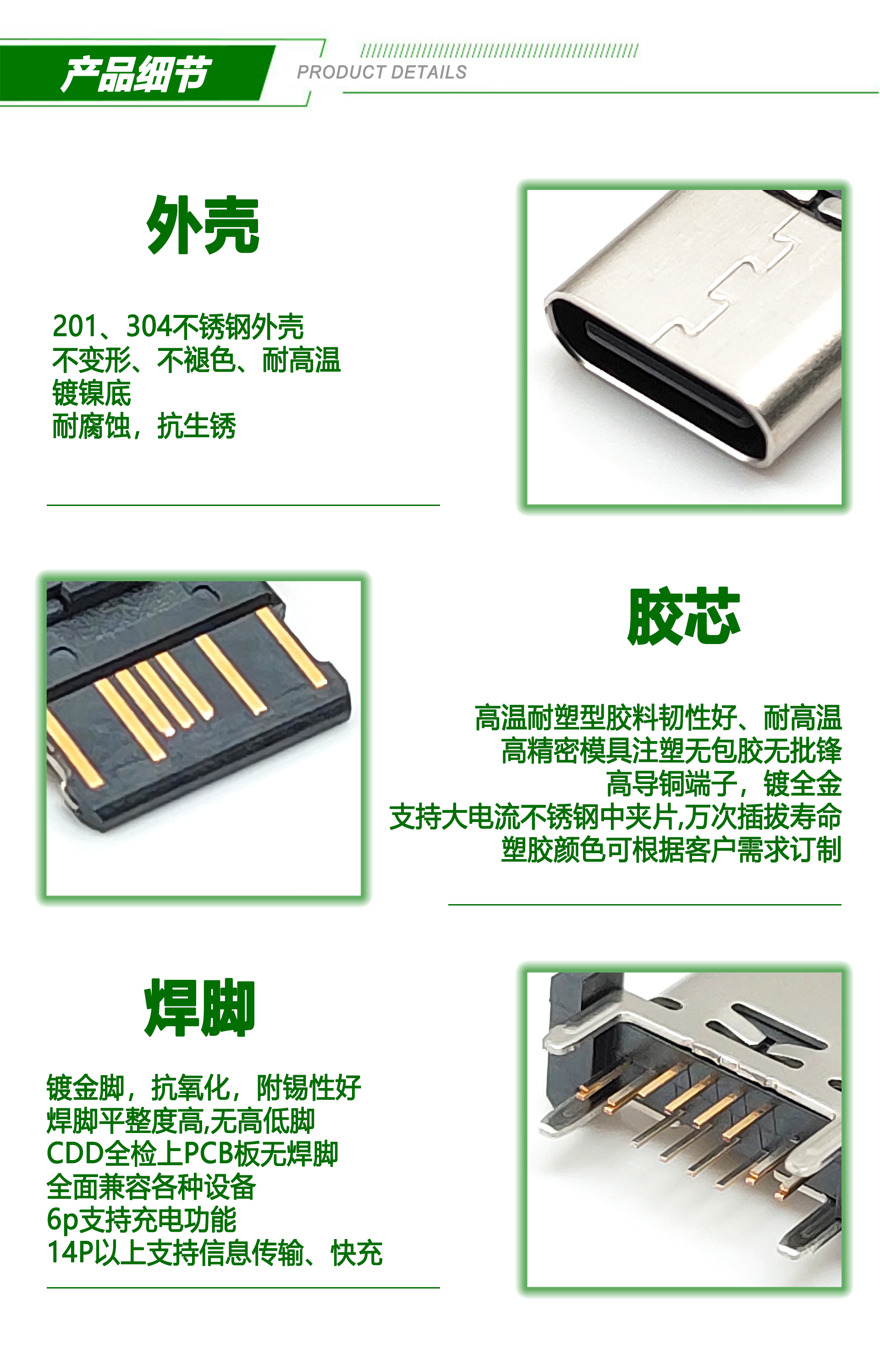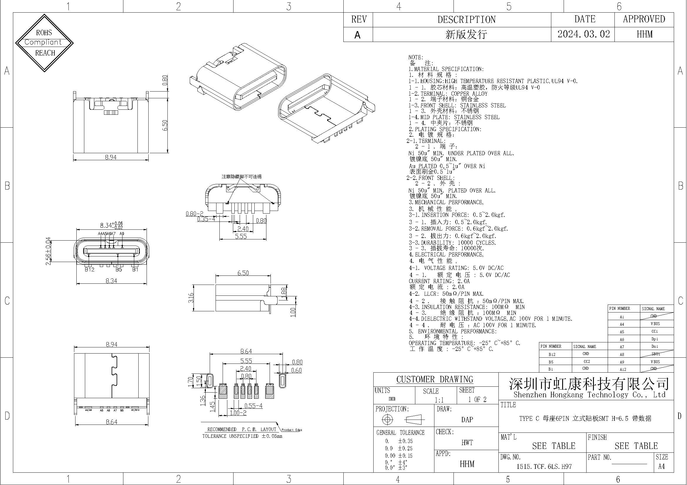 【名称】:Type C 立式贴板母座6PIN 立贴 L=6.5 带数据