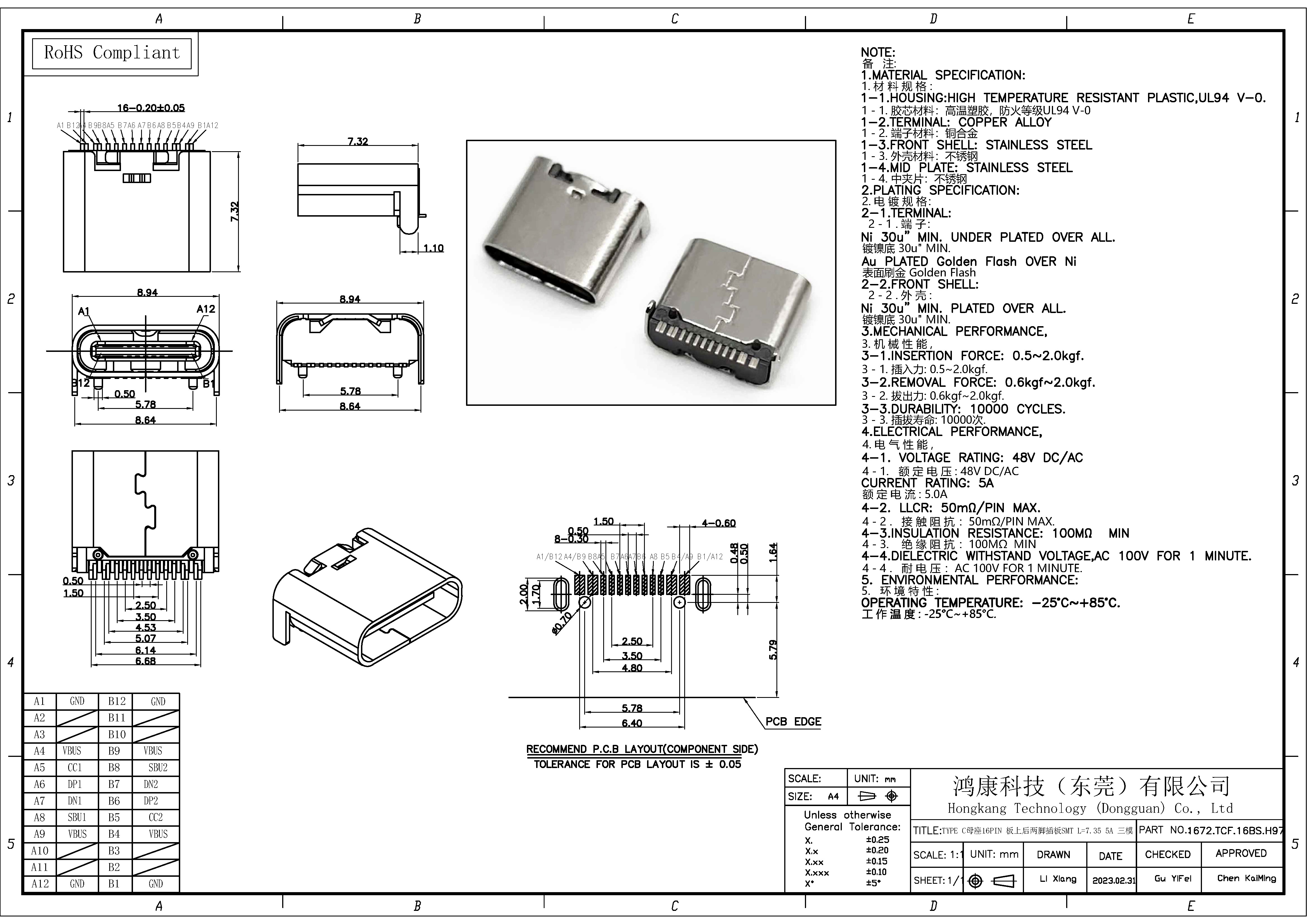 【名称】:TYPE C母座16PIN 板上后两脚插板SMT L=7.35 5A 三模